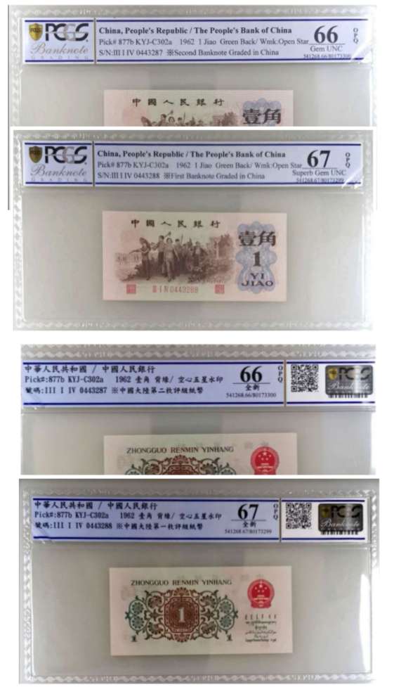 到了2015年5月PCGS开启纸币评级业务,珍藏了整整20年的两张背绿水印壹角券(裸币),从此成为美国PCGS中国大陆第一枚、第二枚评级纸币,等级分别为67级和66级。