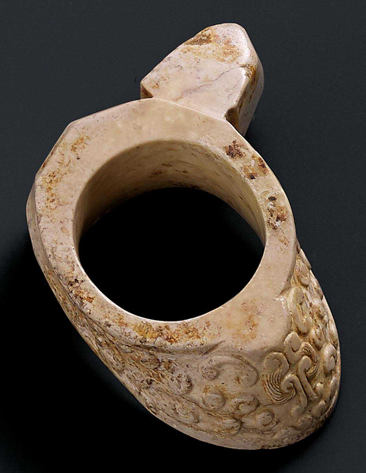 春秋战国时期,韘极为流行。然春秋战国时期玉韘有一明显特徵,即因形制短矮无法容纳勾弓弦的横向凹槽,另外表面雕有纹饰。此反映出玉韘已不能用钩弦和套在拇指上,仅仅是作为佩戴于身上之装饰品。
