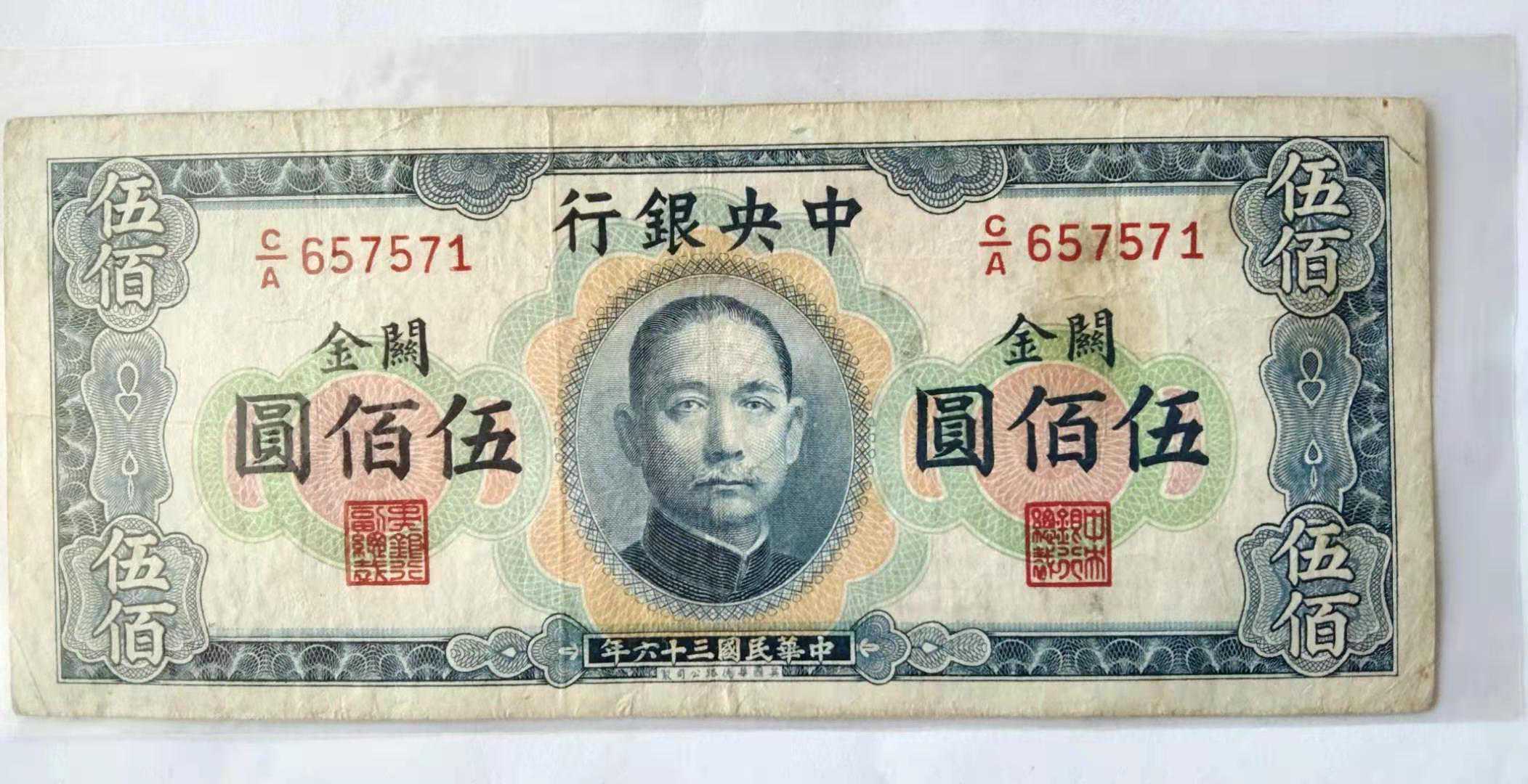 1942年,国民政府看见这个物价涨得厉害,法币贬值,但是作为海关纳税凭证的关金券,口碑很好。于是规定关金券和美元1:1比例,可以按1:20兑换法币,也就是说,这时候,关金券就开始正式在社会流通,也就有了民国36年、37年二种年限版别的关金券。
