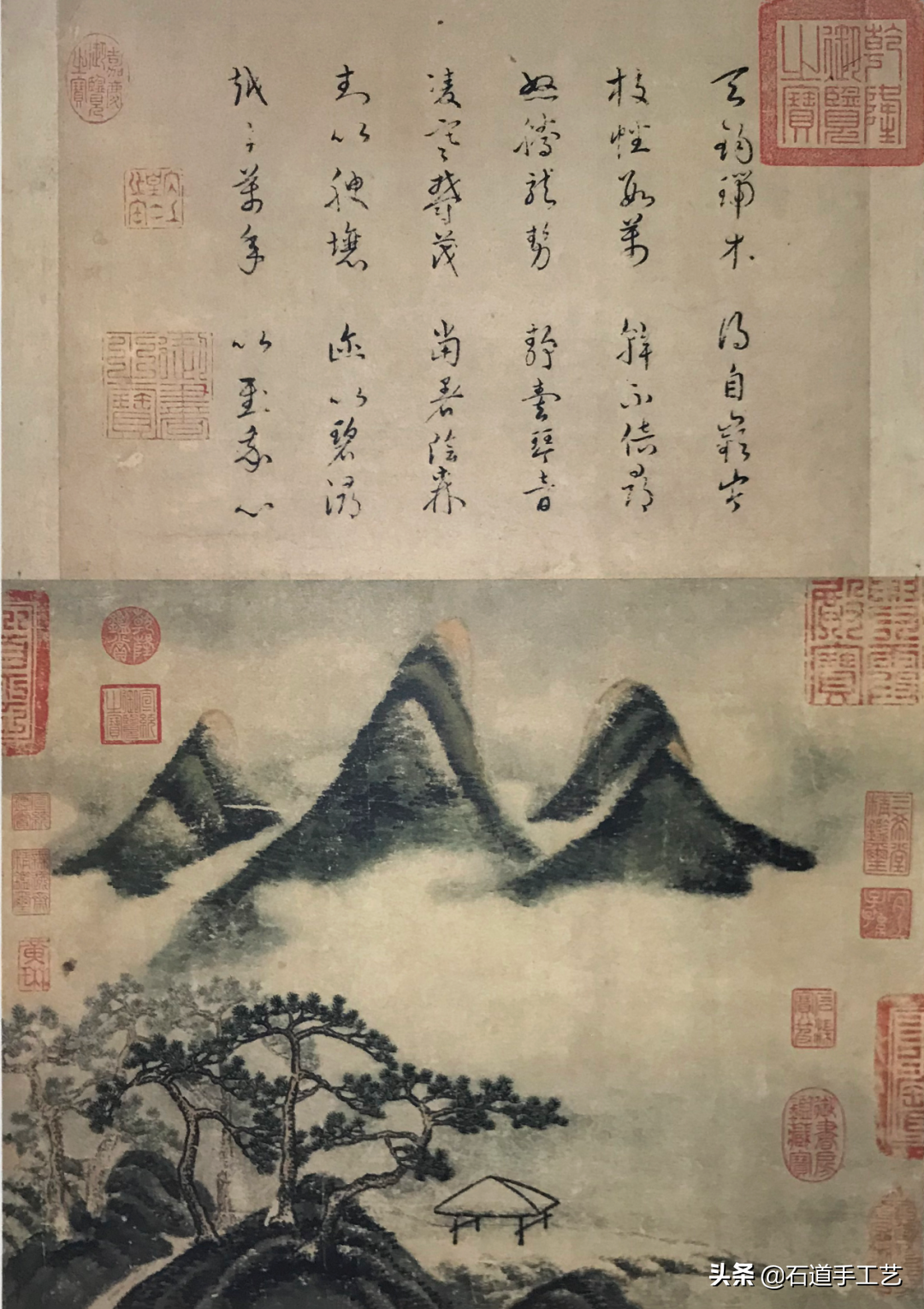 米芾(1051-1107),初名黻,字符章,号鹿门居士、襄阳漫士、海岳外史。以书闻名,画学董源,以墨点作山水,云烟掩映,树木简略而有新意,此乃有名之「米家云山」画法。是幅再现米家画法,诗塘有宋高宗行书题诗一首。