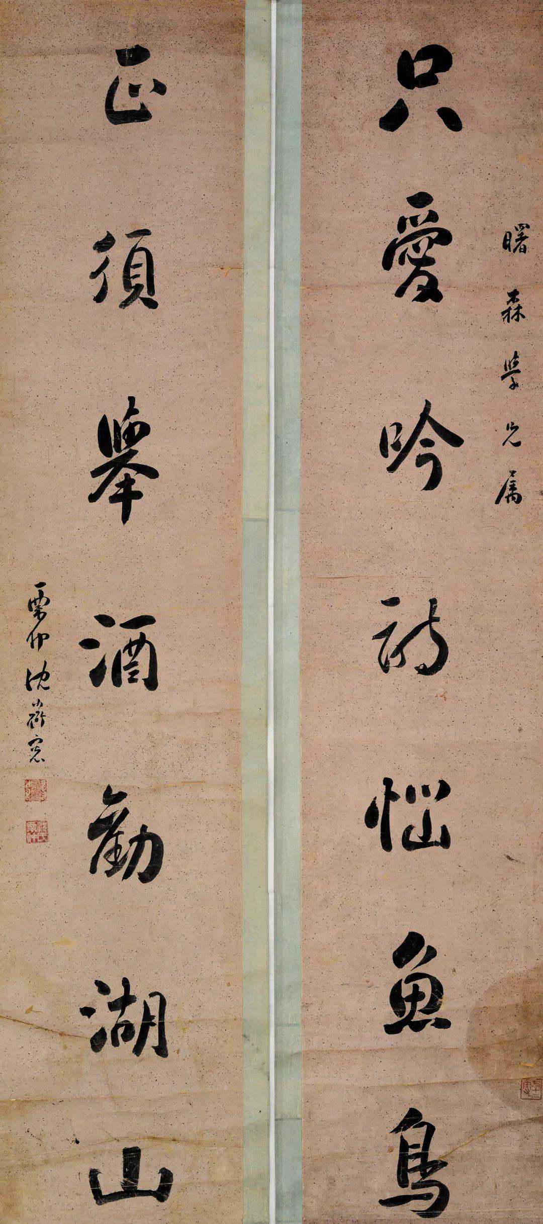 释文:只爱吟诗恼鱼鸟,正须举酒劝湖山。曙森学兄属,栗仲沈道宽。