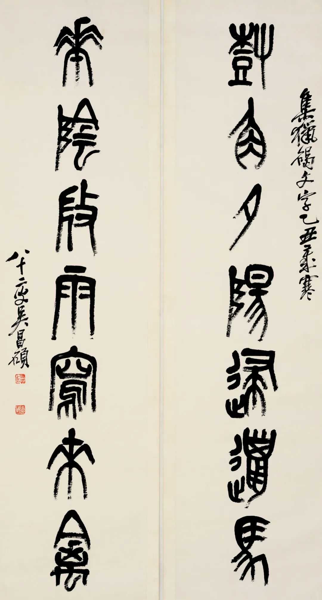 他集“诗、书、画、印”为一身,融金石书画为一炉,被誉为“石鼓篆书第一人”、“文人画最后的高峰”。在绘画、书法、篆刻上都是旗帜性人物,在诗文、金石等方面均有很高的造诣。吴昌硕书法作品,以篆书、行草为主,晚年所书隶书,结体变长,取纵势,用笔雄浑、饱满,具有篆书痕迹,将篆、隶溶为一体,形成独特面貌。