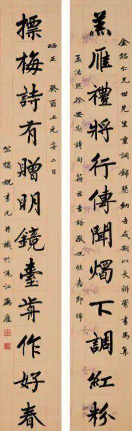 释文:羔雁礼将行传闻烛下调红粉,摽梅诗有赠明镜台前作好春。金铭仁兄世先生重调锦瑟纳吉戒期以长联索书,为集孟浩然徐安期诗句,籍兹吉语敬祝,休嘉即晞。哂正,癸酉上元前二日。竺楼祝书元并识于浥江寓庐。