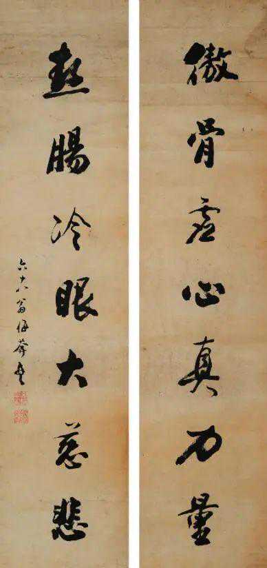 释文:傲骨虚心真力量,热肠冷眼大慈悲。六十八翁梅庵书。