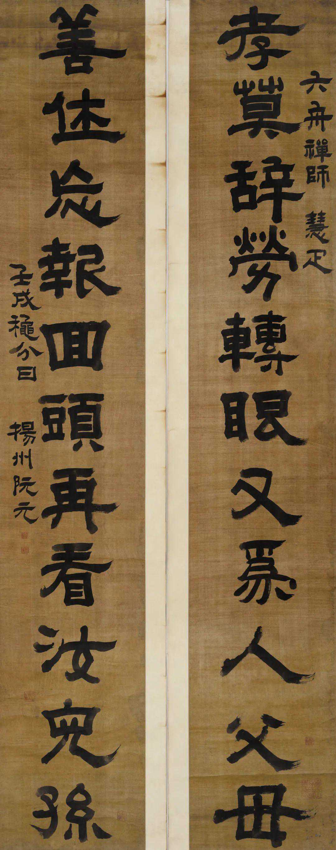 释文:孝莫辞劳转眼又为人父母,善休忘报回头再看汝儿孙。六舟禅师慧疋,壬戌秋分日,扬州阮元。