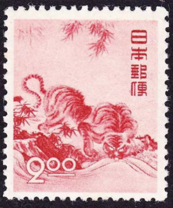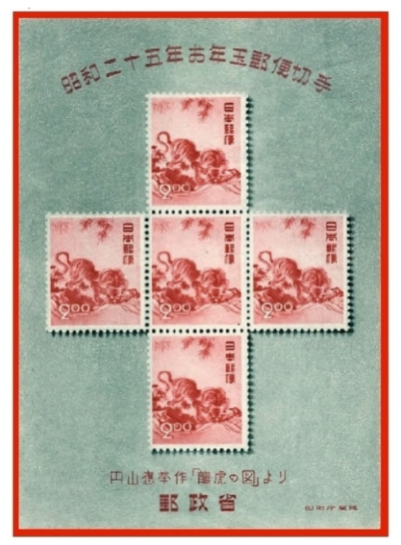 世界上第一枚生肖邮票是1950年日本发行的虎年生肖邮票,邮票图案采用了日本江户时代绘画大师圆山应举的名画“龙虎图”中的“虎图”。有趣的是,其发行组合图案是由5枚虎票组成的“十”字形。