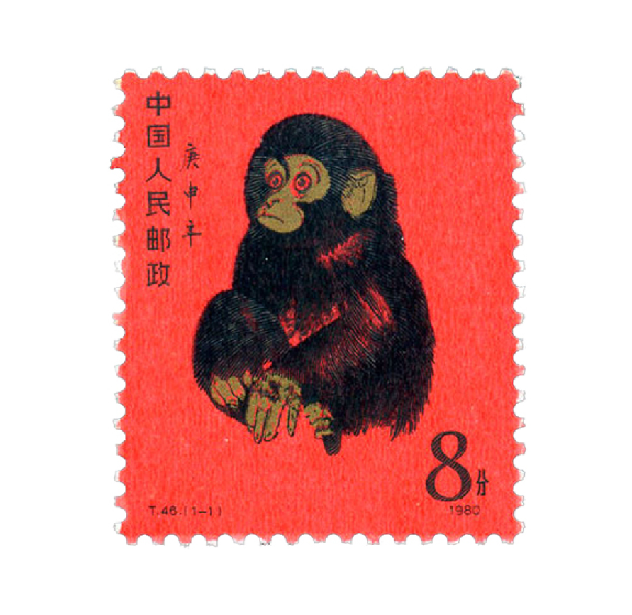 而我国第一枚生肖邮票发行于1980年,也就是大名鼎鼎的“猴票”。该票全套1枚,面值8分(人民币)。票面为一只毛发浓密、灵性活现的小黑猴坐在大红衬底上,惹人喜爱。邮票原图由画家黄永玉创作,邮票设计家邵柏林设计,雕刻家姜伟杰持刀,经北京邮票厂印制发行。这枚经典的邮票在发行之初受到短暂冷遇后价格竟一路飙升,成为邮票界神话。据说如今在邮票收藏界,这枚邮票按其重量等身价已超过黄金价格。
