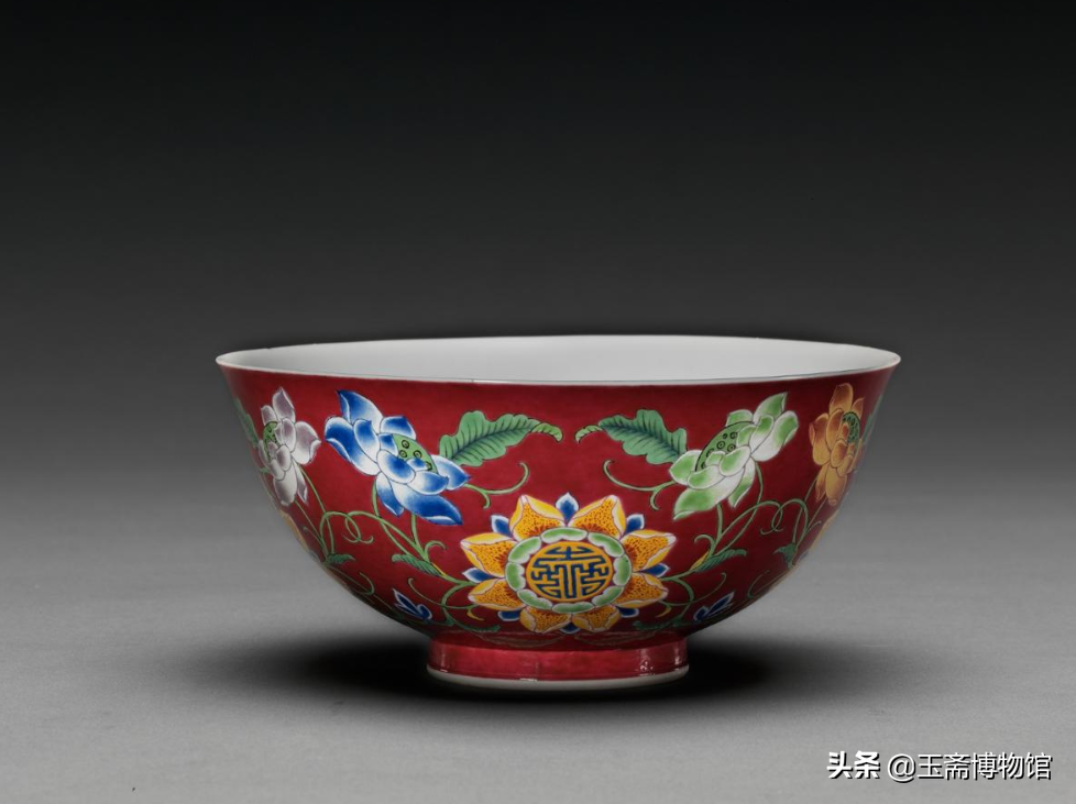 御制款胭脂红地珐琅彩莲花团寿纹碗北京故宫博物院藏