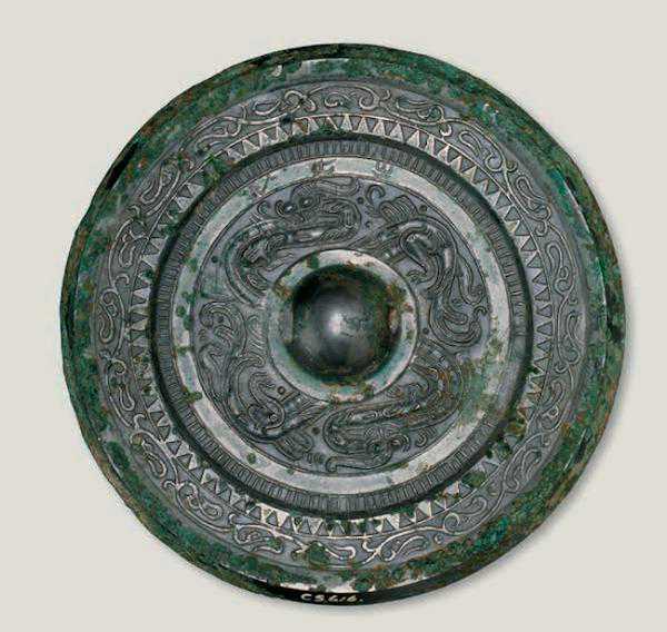 还有一些战国蟠螭纹镜纹饰以密集的细线来表现,不易辨识。值得称道的是1976年湖北江陵县张家山201号战国晚期楚墓出土的透雕蟠螭纹镜,镜背纹饰呈十字对称,分为四组两两相对的蟠螭纹,均为侧面形象,弧形短角,圆眼,张口,身躯呈S形,屈曲柔美,尾部向上翻起内卷(图二)。“镜里千秋”展览展出。