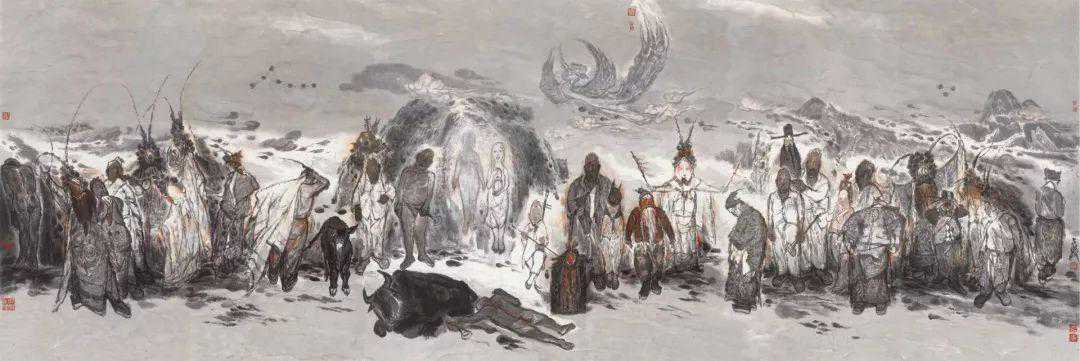 画院画家的创作,对题材的社会性、历史性和主题性的敏感,会超过很多不在画院的美术从业者。画院画家总是需要阶段性地完成一些命题创作,久而久之,会形成一种艺术思维模式,自觉或不自觉地站在国家和体制层面,去完成自己的创作,从而塑造出“国家美学”风范。这种美学风范最能够折射出现实主义在中国的命运,传统文人画在当代的命运;也能较充分地表达中国画家的“终极关怀”到底能够抵达什么层次;当然,除了表达“国家美学”这种共同意志,我们也可以通过袁武、张江舟、梁占岩的作品,看看“国家美学”在某些个人化表达十分强烈的画家的语境中,会遭遇什么样的有趣变化,看看体制化的力量又是如何同个人的天才与良知博奕和互动。