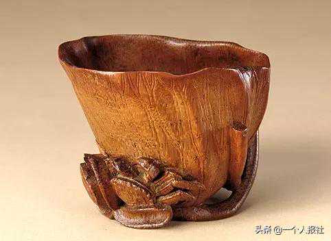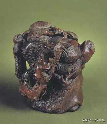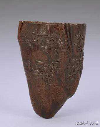 此杯依材质的天然形状随形雕成,器表以线浮雕的手法刻画宋代文豪苏轼赤壁夜游的故事。口沿处刻“东坡游赤壁图”六字及“希黄子”款,据此知为明代雕刻高手张希黄的作品。此酒斗雕刻技法娴熟,所刻人物、景致栩栩如生,可见名匠之功力。沉香木为珍稀的木材品种之一。此杯材质的色泽与犀角的颜色酷似,如不细察,极易混于犀杯之类。