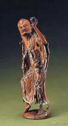 此像立姿,肩系葫芦,身着破衣,围百结叶裙,瘦骨嶙峋,虬髯连鬓,赤双足,一腿跛起,一腿直立,右腋下架有一拐,左臂抬起,手捏一只蜘蛛,在后衣裙下方刻有阴纹“至正二年制”隶书款。李铁拐是民间传说的八仙之一。元代以后,对八仙的各种传说愈趋离奇,以八仙为题材的各种雕刻在工艺美术创作中也十分众多。