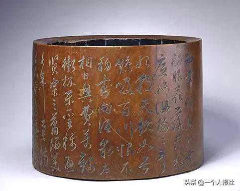 笔筒圆体,略扁,形体硕大,口沿微内倾,筒壁厚实,庄重沉稳。内壁髹黑漆,外壁阴刻唐代诗人杜甫的《饮中八仙歌》一首,与原诗略有出入: