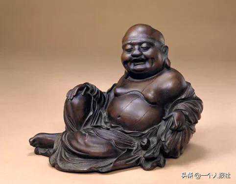 佛像以紫檀木制,闭目,笑口半开,大耳垂肩,袒胸露腹,盘腿曲肱依袋而坐,左手捏布袋,右手抚膝。