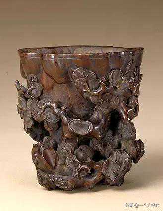 杯以非洲犀角的后角制成,角质坚实细腻,色泽如蜜,呈浅棕黄色半透明状。利用犀角天沟自然凸凹的部位镂刻两株缠枝葡萄藤做柄,枝曲叶展,果实圆大。杯柄的左右两侧,雕雌、雄两鸡带着数只雏鸡,雏鸡或觅食,或躲于雌鸡翅下,或跳在雌鸡背上玩耍。杯内壁利用犀角天然的地岗部位,刻出一块垂岩,葡萄藤盘曲缠绕悬挂在岩壁下,叶、果点缀其间。在平底的边缘处刻有阳文“尤侃”篆文小方印,印款字小,几不可辨。此杯纹饰美,雕刻技法精湛,展现出一幅寓意深刻的锦鸡教子图,使人观之韵味无穷。