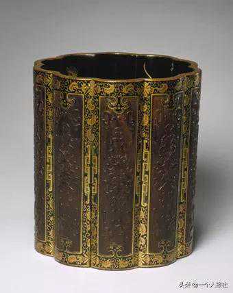 笔筒椰子木制,十瓣葵花式。筒身髹黑漆,饰描金花卉纹,每一凸瓣均留出长方形开光,开光内在原木地上浅浮雕变体几何纹样,每瓣纹样相同。内壁满髹黑漆,并以金漆描画各式折枝花草纹。底部亦为黑漆地描金花卉纹。此器所应用的漆工艺似受到日本金漆莳绘的影响,较为特别。黑漆描金艳丽悦目,而木色沉暗蕴藉,相互衬托之下,装饰效果更为突出。