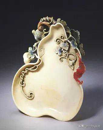 笔掭为浅缘盘,葫芦式。盘上浮雕并镂雕葫芦枝蔓、叶片及小葫芦为饰,并蜿蜒于盘侧及底部,又伸入盘内,增添了器型的变化。盘仿葫芦形的束腰处则浮雕一蝙蝠。