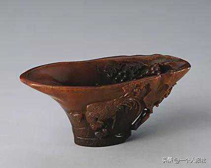 尤侃款犀角雕葡萄禽鸟纹杯