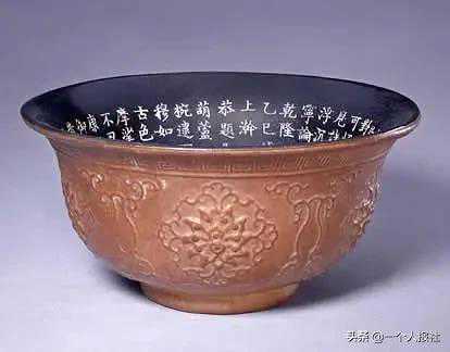 碗侈口,敛腹,圈足。外壁近口沿处饰阳文回纹带,主体纹饰为蕃莲及卷草纹5组。内壁髹黑漆并刻阴文楷书御题诗:
