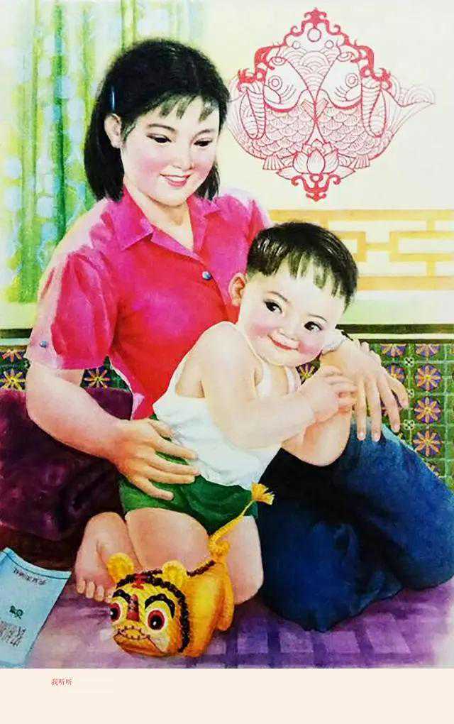 赏析:这幅娃娃抱鱼的年画,取自那个年代家家户户必备的年历画。每到年末岁尾,大人们根据自己的喜好从供销社精挑细选出一幅,买回来挂在家里最显眼的位置,方便随时查看日历和节气,而农历图上喜庆祥瑞、惹人喜爱的图案,则会陪伴全家人整整一年的时间,几乎每天都会瞅几眼,熟悉得不能再熟悉,以至于过去许多年以后,再次见到相同的图案,依然那么熟悉和亲切,甚至产生一种恍若隔世、跨越时空的感觉。