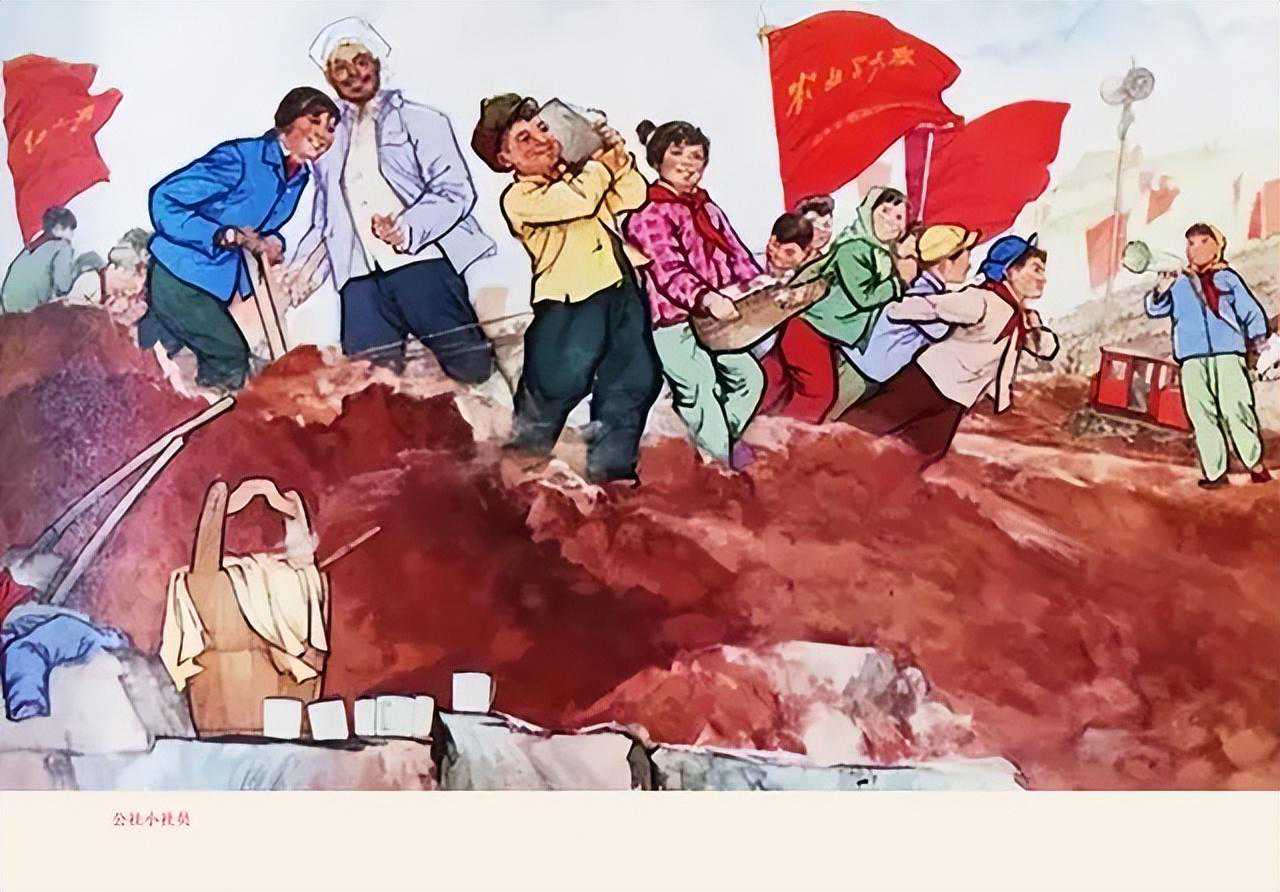 水利建设会战当前,红领巾们更是不甘示弱、主动请缨,也来到了建设工地上参加劳动。他们有的肩扛石头,有的用簸箕运土,有的合力拉纤挖土,有的担负起宣传员职责,举着纸喇叭大声喊口号,给工地上的劳动者们加油鼓劲。担任工地总指挥的老队长和“铁姑娘队”的姑娘看到小学生们宛如一只只勇猛无畏、敢打敢拼的小老虎,人人脸上流露出赞许的笑容。是啊,红旗下的孩子们正在茁壮成长,已经成为了名副其实的公社小社员。