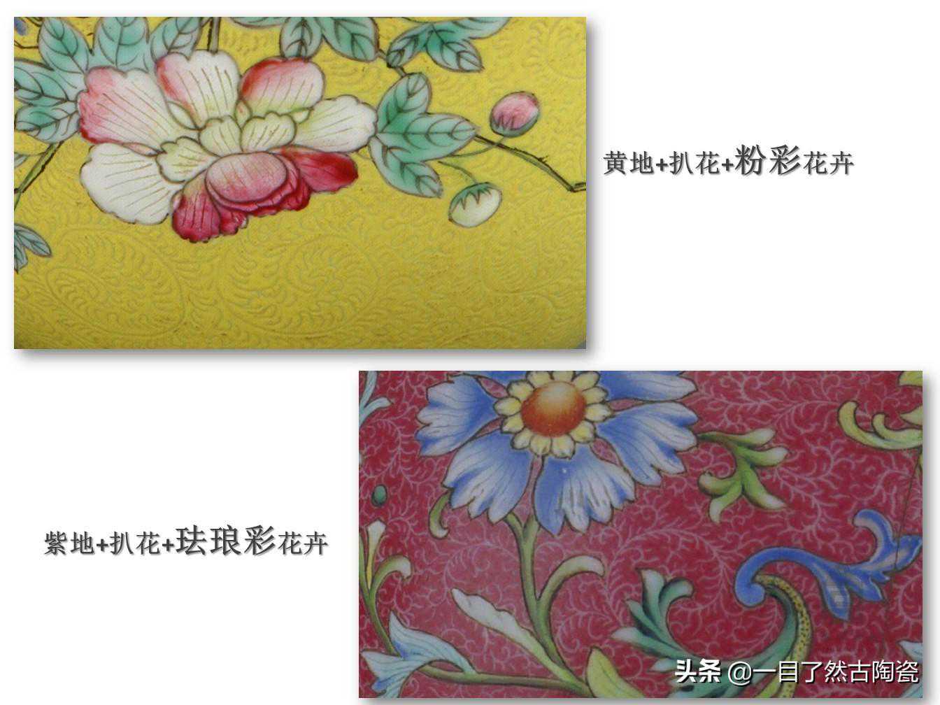 粉彩扒花底色的瓷器再加上粉彩花卉或者加上珐琅彩花卉的对比: