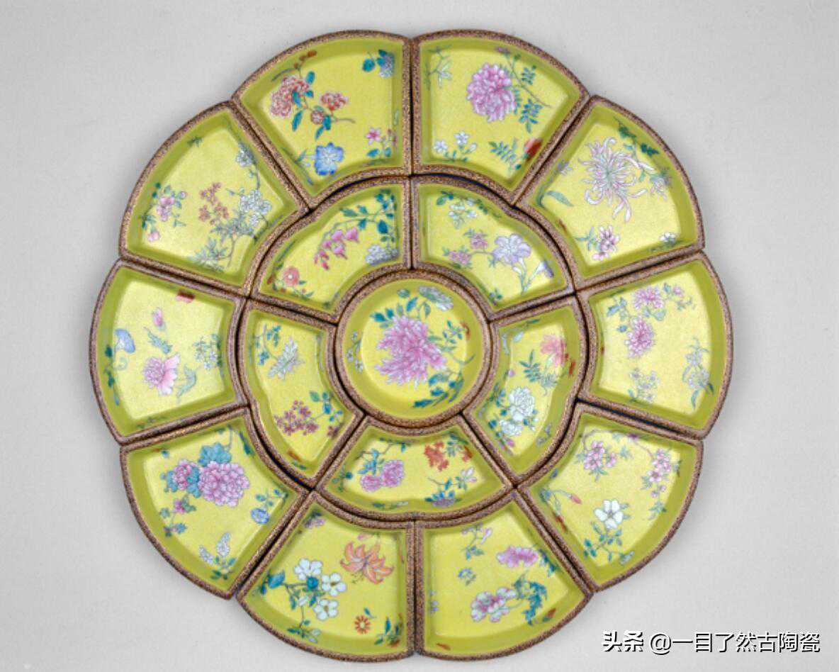 清乾隆淡黄地粉彩轧道花卉纹攒盘