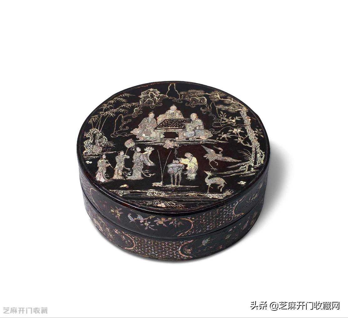 2:元黑漆嵌螺钿人物故事盒,尺寸:直径20.3厘米,估价:RMB700,000~1,000,000,成交价:RMB1,437,500