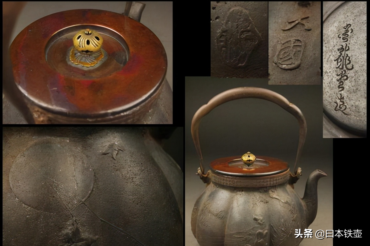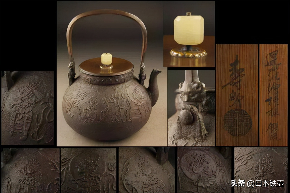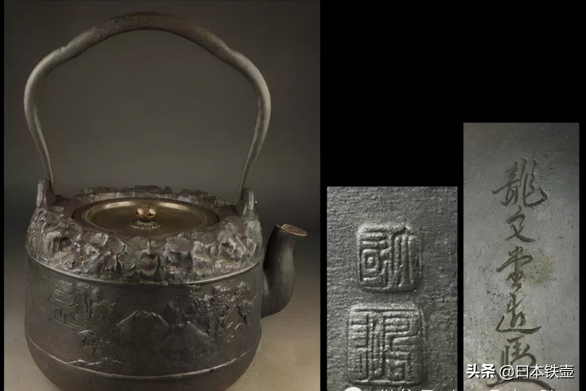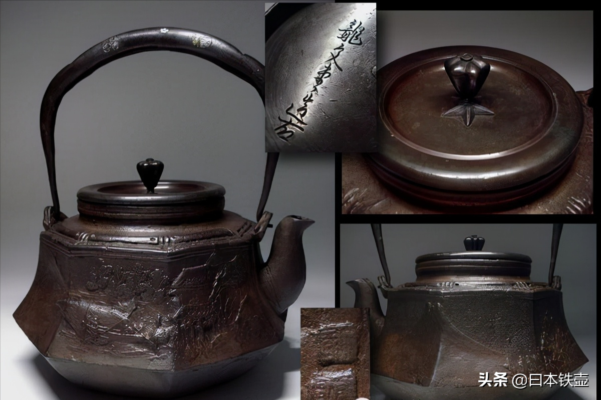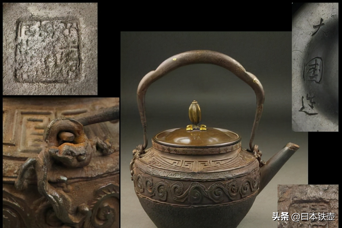 京都铁瓶第一家“龙文堂”在明治时期达到空前鼎盛,此期间吸纳许多优良铸物师为其麾下效力,较知名的有安之介、大国寿朗、上田照房、井上四大天王。大国寿朗的壶身多以诗文、花鸟为主,在砂模上精细刻划出反模成就的铸物工艺,目前工艺师已难以追越。