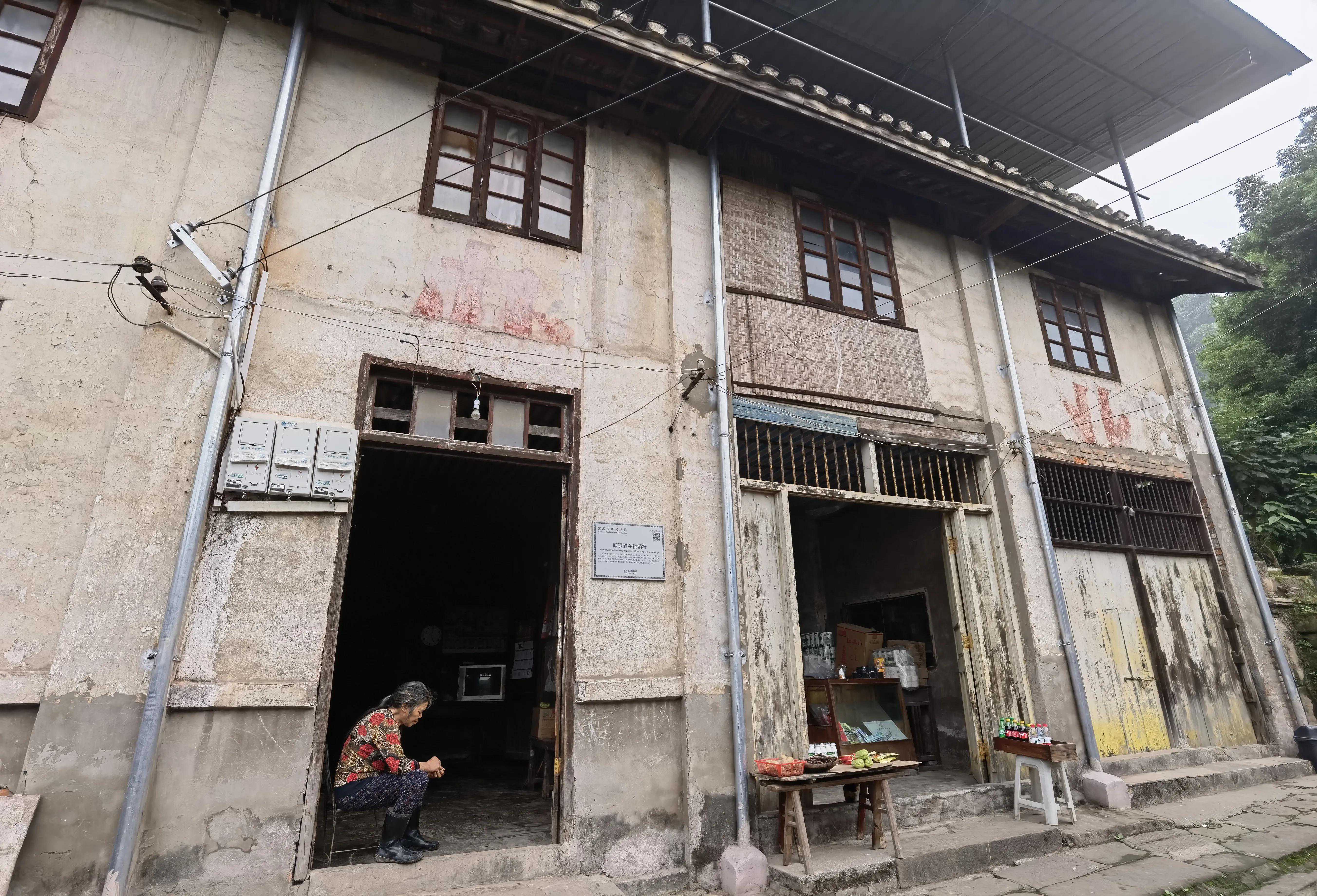 沿着老街向前走,两边坐落着砖木砖石结构的老房屋,很多已经成了危房。供销社旧址下的有一只猫咪,去逗一下。这栋建筑反映了社会主义改造时期的公共建筑建造情况,是铜罐驿镇历史发展变迁的物质载体。