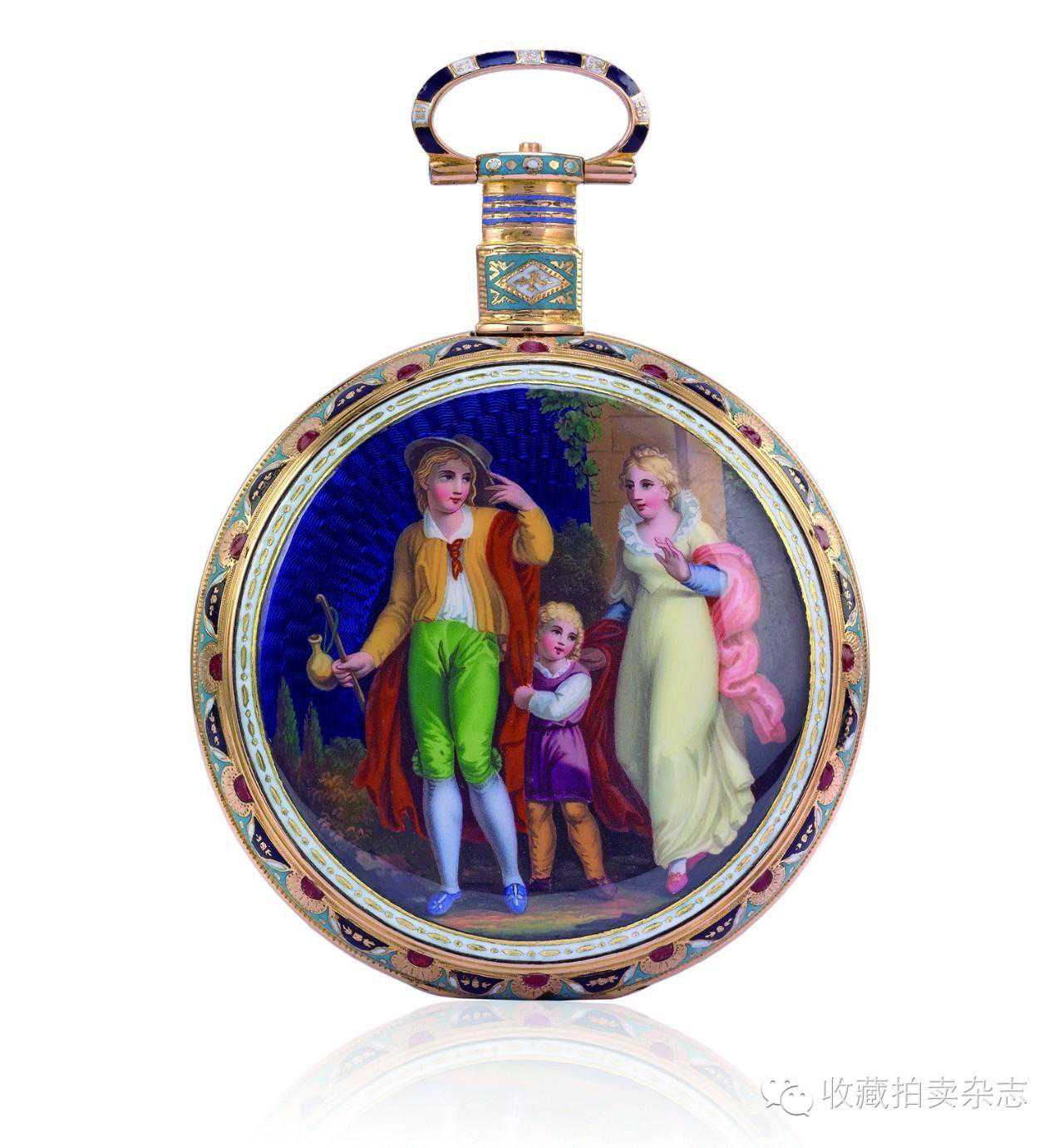 瑞士珍珠七弦琴音乐怀表,18k金,表背上用珐琅绘制了3位弹唱的乐手,乐手能在特定的时间里随着音乐舞动,这枚怀表制作于1820年左右,是特别为中国市场制造。拍品编号Lot174/Sale2453,2011年纽约佳士得,29.05万美元成交。