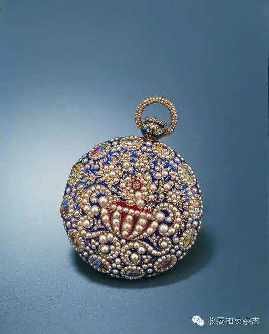 PiguetMeylan石榴形怀表,黄金,掐丝珐琅镶小珍珠,二问打簧,中置秒针,据说由英皇室送赠中国乾隆皇帝之御品,约1820年制,拍品编号Lot3537/Sale2627,2008年香港佳士得,290万港元成交