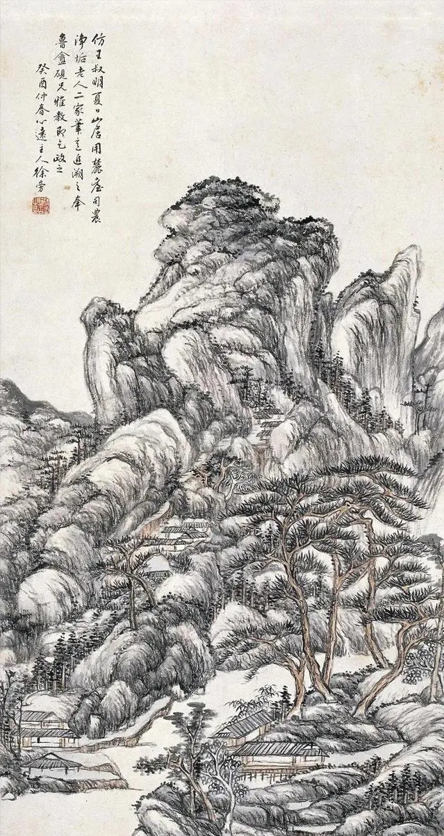 题识:仿王叔明夏日山居,用麓台司农、净垢老人二家笔意追溯之。奉鲁庵砚兄雅教即乞政之。癸酉仲春,心远主人徐旁。
