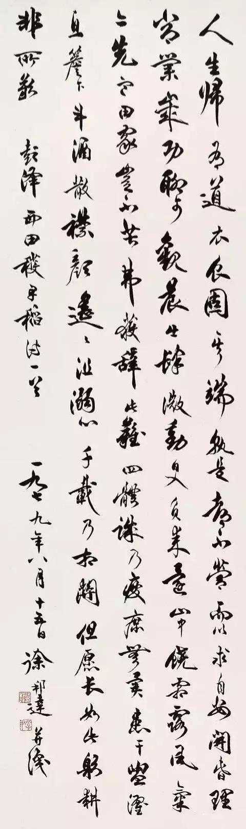 纵观徐邦达的行书(徐多以行书面世,特别是晚年的书作),给人的总体感觉可以用峻拔崎岖、汪洋恣肆来概括。由于其行笔快慢兼施,笔墨酣畅淋漓。结体自然舒展,圆润婉转,粗壮如金牛健步,细密如龙蛇逶迤,线条疏密相间,行中带草,体圆用方,极尽笔法变化,给人的感觉是如此地典雅。