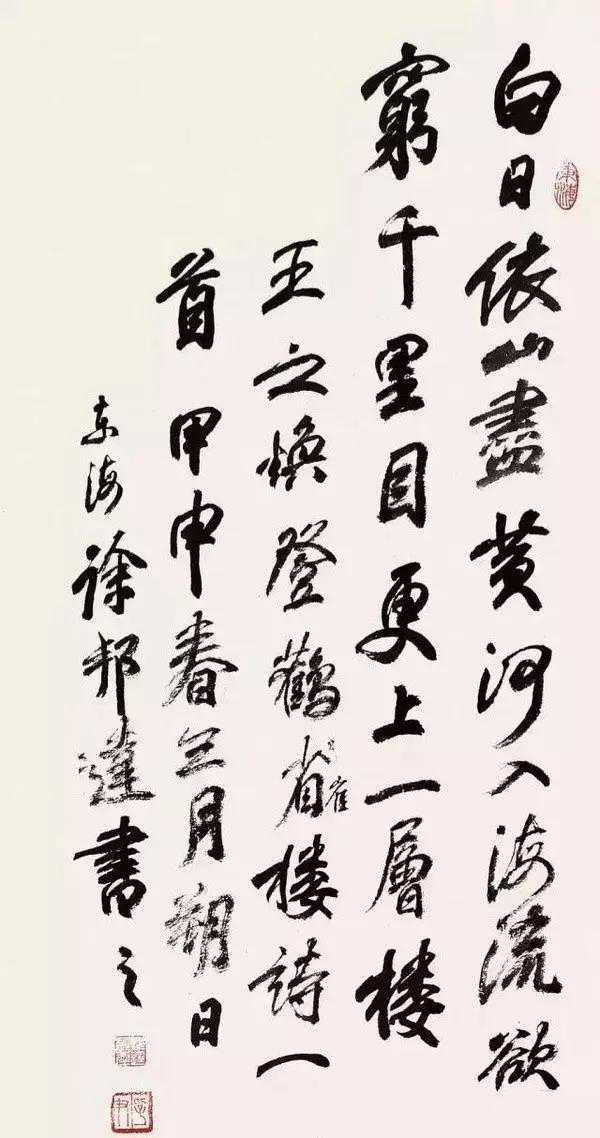 从取法上来说,徐氏书法多从宋人苏东坡、米襄阳出,然而却汰去了苏字之肥、米氏故作姿态的夸张习气,取苏字之厚重宽博、米字之尽秀极妍,上溯李北海的“气体高异”,下参董其昌的秀逸古淡,再辅以过目不下数万件书法名迹的滋养,终使作品透溢出一种博大深远的气势和韵味无穷的神韵。