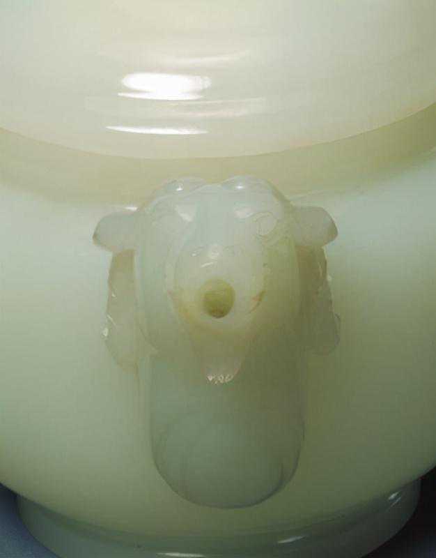 玉执壶是清代宫廷重要的陈设品,样式极多。将三只羊组合的艺术造型和纹饰图案在清代非常盛行。除了玉器,陶瓷、青铜器和绘画中往往亦以三羊作饰,俗称“三阳开泰”。古时“羊”通“阳”,据《易经》记载:“正月为泰卦,三阳生于下。”后人因“阳”、“羊”谐音,用三羊喻三阳,取其冬去春来阴消阳长,有吉亨之象,多用于岁首祝颂之辞。