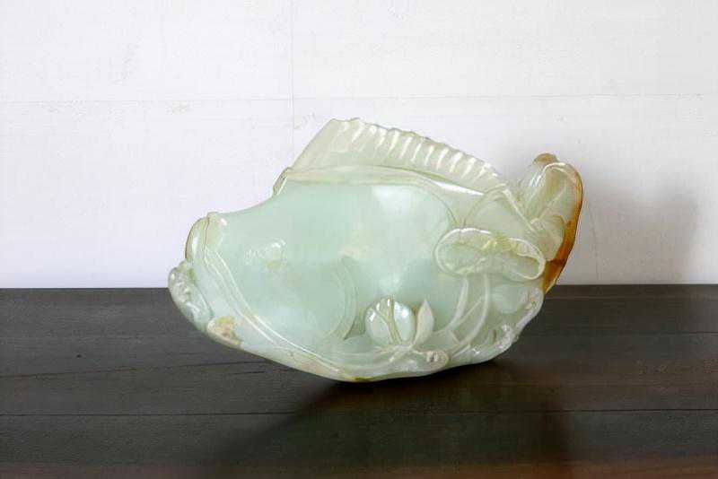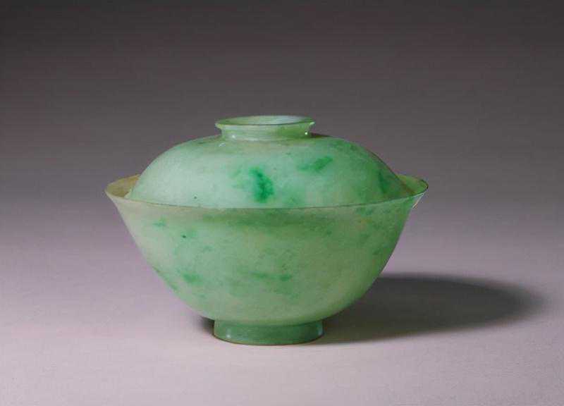 制作这样一个翠玉盖碗需要使用很大的一块翠料。此碗所用料绿白相间,色泽鲜艳。器壁很薄,并带有优美的弧度,做工精致,当出自治玉高手。