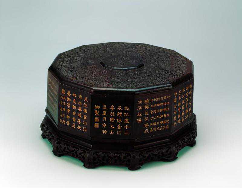 盛放玉器的紫檀木盒为十二角形。盒盖面中间为阳文篆书“万年甲子”,外围篆书“子丑寅卯辰巳午未申酉戌亥”一周,再外围是两圈各种篆体组成的“万寿”字样。盒盖内为填金隶书“用十二辰本事题四库全书”,末署“乾隆乙未夏御制”,并阴刻“几瑕怡情”篆书四字方印。盒外侧十二面有隶书填金乾隆御制诗。木盒底座为镂空雕花十二面围栏,并出十二云形足。