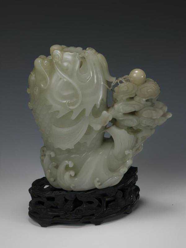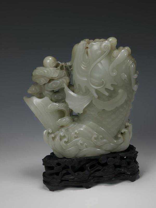 青玉龙首鳌鱼花插,清,高18cm,宽17.7cm,厚7.6cm。