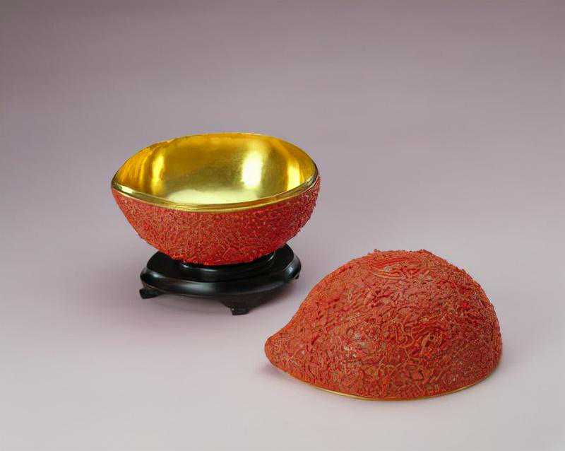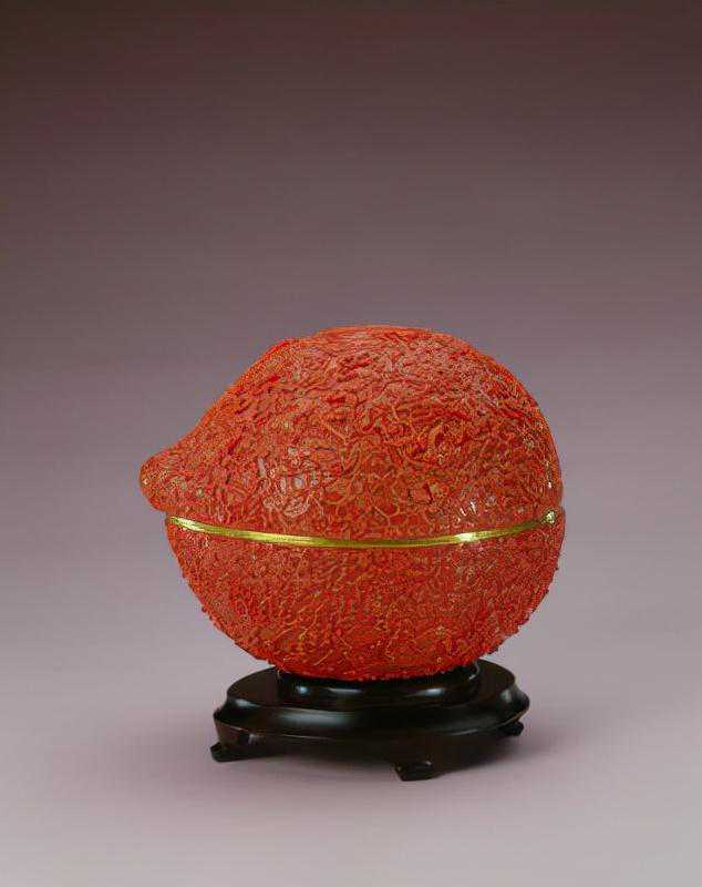 金胎珊瑚桃式盒,清,高19cm,长22.5cm,宽20cm。