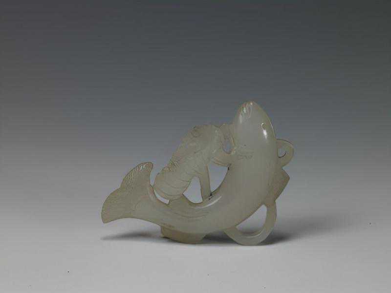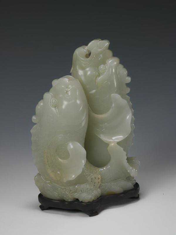 青玉衔莲水座大鱼,清,长24.5cm,高13.5cm。