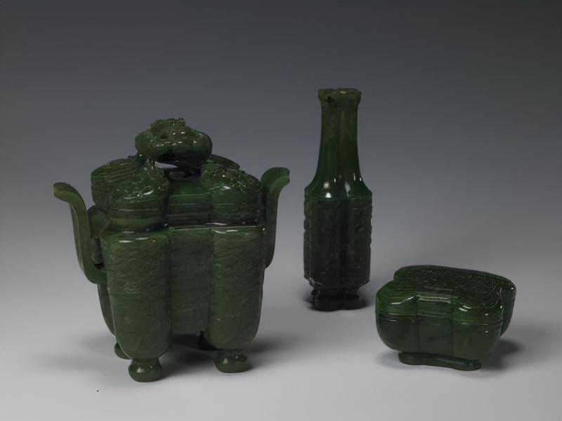 碧玉四柱式炉、瓶、盒三式,清。炉通高11cm,通宽11.1cm,炉方径7.3cm;瓶通高11cm,最宽2.2cm,厚2cm;盒高3.8cm,边长5.8×5.3cm。