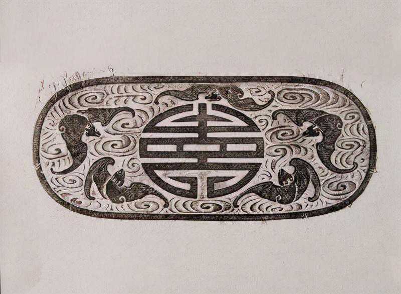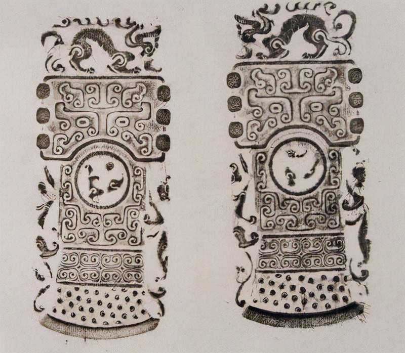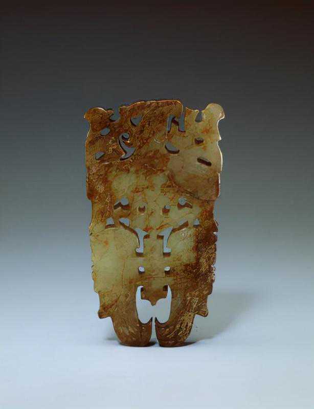 此器为传世古玉,表面纹饰较模糊,有较大面积的赭色斑。器近似梯形,凸面,顶端上凸,中线两侧向后折,上下折角的角度不同。嵌饰正面为浅浮雕兽面纹,重点表现兽的环形双眼及阔嘴。兽面两侧饰前肢,短小,带爪足。兽面及兽肢上饰细密的阴线回纹。饰件背面有4组通孔,每组孔由两个斜孔对接而成,孔中可穿绳。
