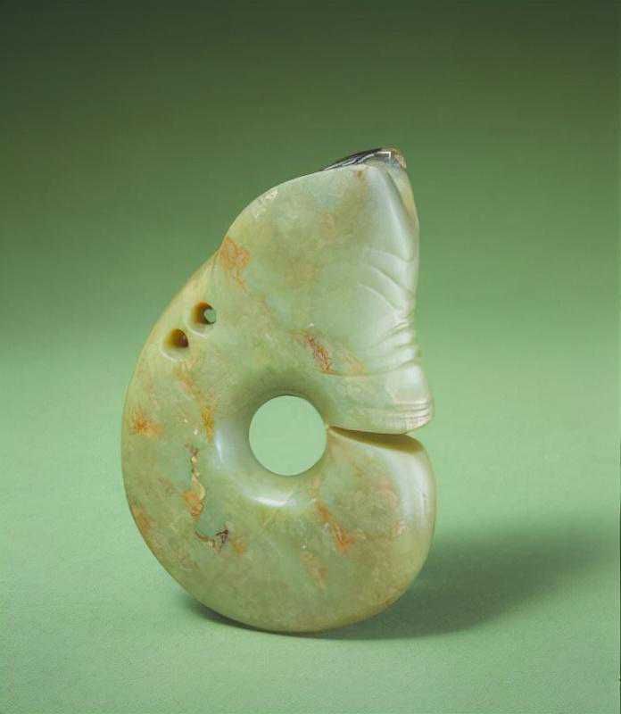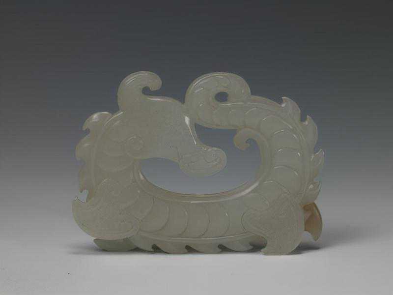 碧玉镂雕夔龙璜,清,长14.8cm,宽5.2cm,捐献自章乃器。