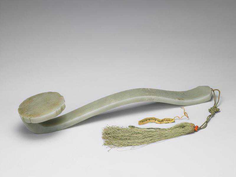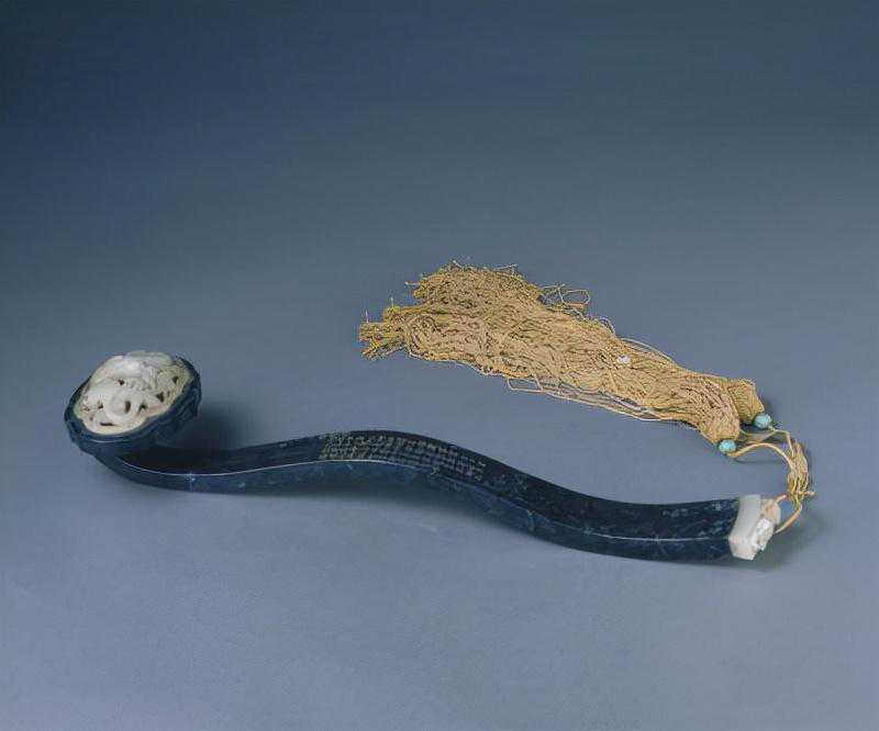 乾隆帝一生曾于十六年、二十二年、二十七年、三十年、四十五年、四十九年六次南巡。柄上文字系乾隆二十二年(1757年)二月,乾隆第二次南巡途中,乘船饱览风物之余,一时遣兴所临。黄条一面墨书“道光十八年五月初一日收宁寿宫交”,另一面“青玉诗意如意一柄”,可知此如意道光十八年(1838年)五月初一日前曾陈放于宁寿宫中。
