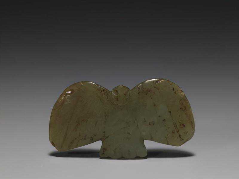 红山文化分布于我国东北地区,在其遗址中发现了较多的玉器,其中有一定数量的玉鸟,多为鹰类。常见的玉鹰有二类,一类近似方形,翅的边缘平直;另一类鹰的翅膀大且展开,似飞翔状。这件玉鹰属后一类,辽宁省阜新市胡头沟遗址出土有同样的作品。此玉鹰的造型较接近于现实,鹰的腹面加工精致而背部简练,系因人们仰望飞鹰所得的观察结果。