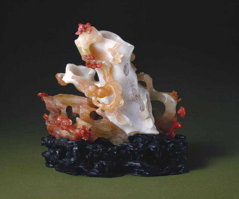 红白玛瑙蝙蝠桃树花插,清,高19.3cm,宽22cm。