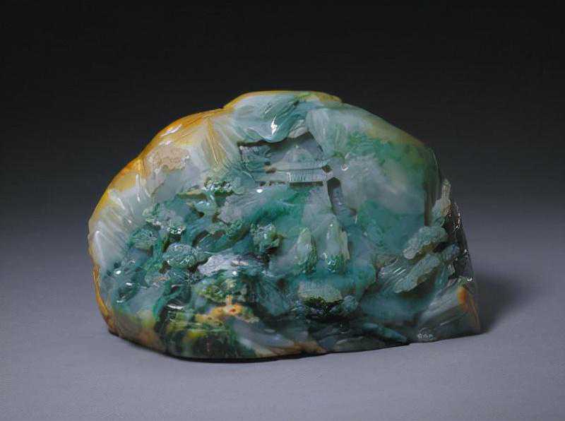翠雕人物山景山子,清,高16.1cm,长24.7cm,宽10.5cm。