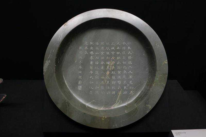 这是乾隆二十一年(1756年)清军平阿睦尔撒纳叛乱战事中,在伊犁缴获并呈进内廷的战利品。乾隆帝非常喜爱,于乾隆二十二年(1757年)命工匠在玉盘内镌御制诗:“绿玉大盘径二尺,围盈六尺含精泽。葱岭之产葱其色,砑光无瑕抚无迹。团䂓寳月三五魄,素质弗事雕几饰。弘璧琬琰谁则识,荒唐徒见传荆国。岁贡用征远人格,成器仍藉他山石。汤之盘铭日新徳,既宏博厚宥笋席,式如比义思无斁。”