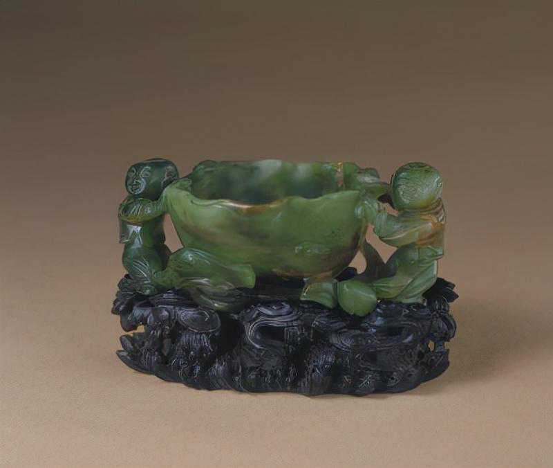 碧玉镂雕双婴耳荷叶杯,清,口径6.8cmX6cm,高4.2cm。